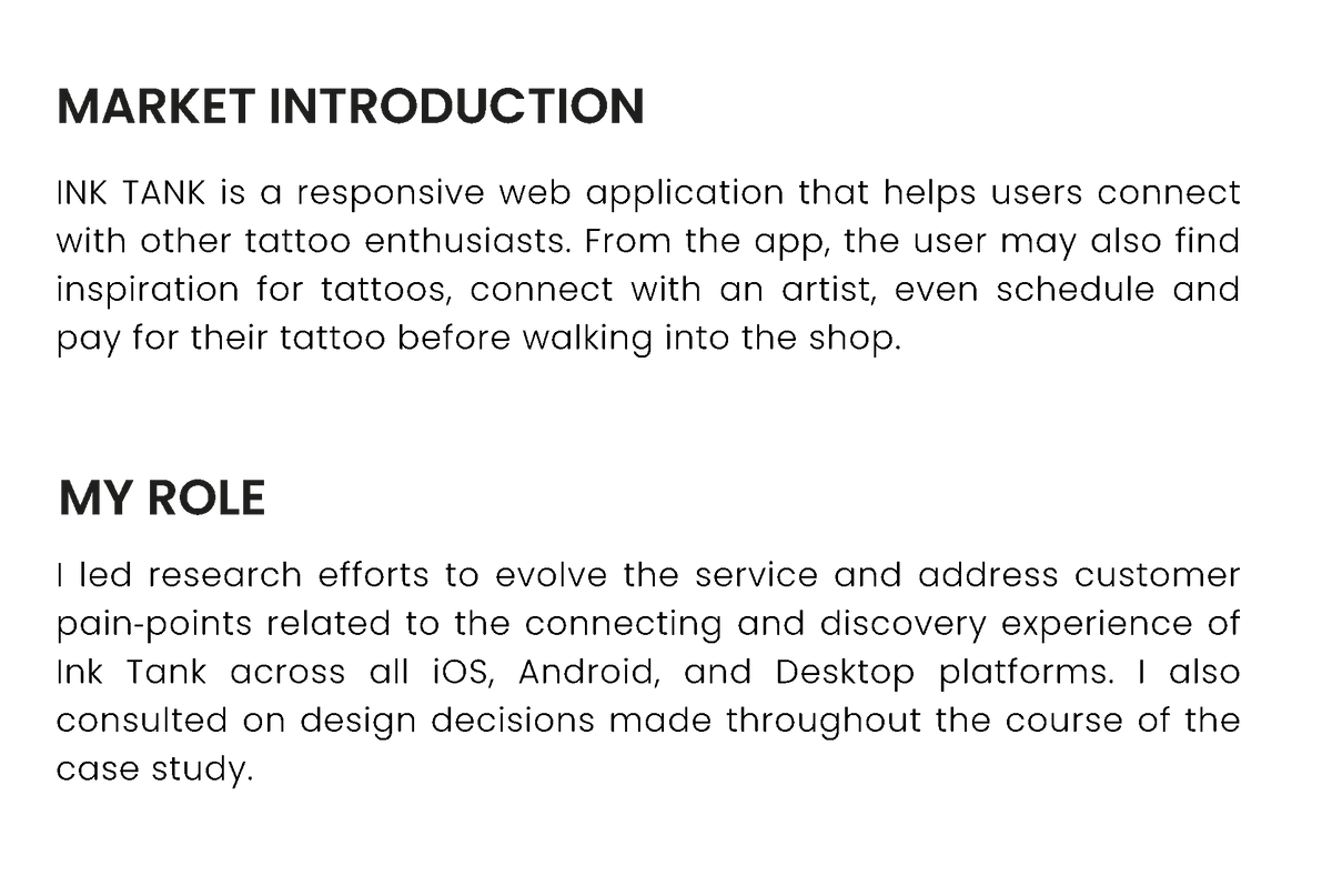 My research uncovered limitations we were not aware of when users interacted with tattoo applications. A twenty- five client-focused survey taken online provided data that revealed after analysis that the competitor apps did not connect users with an actual tattoo artist, nor did they have capabilities for a virtual consultation. Also, there was a need to have a social community where users could discuss tattoo trends, overall advice, and design collaboration.